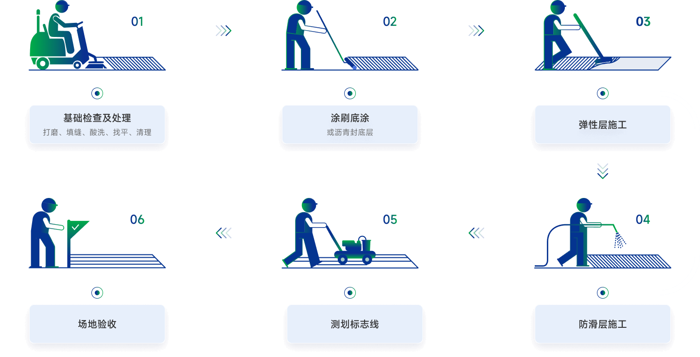 噴面防滑層:由雙組份聚氨酯膠與EPDM顆?;旌蠂娡浚纬煞阑瑢?;厚度一般為3mm,提供可靠的摩擦力。